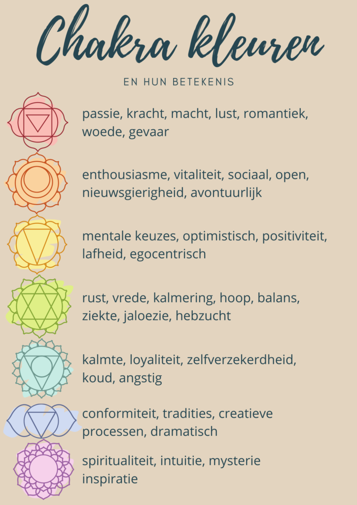 Hieronder zie je de 7 hoofdchakra´s hun plaats, hun bijbehorende kleuren en waar ze voor staan.
